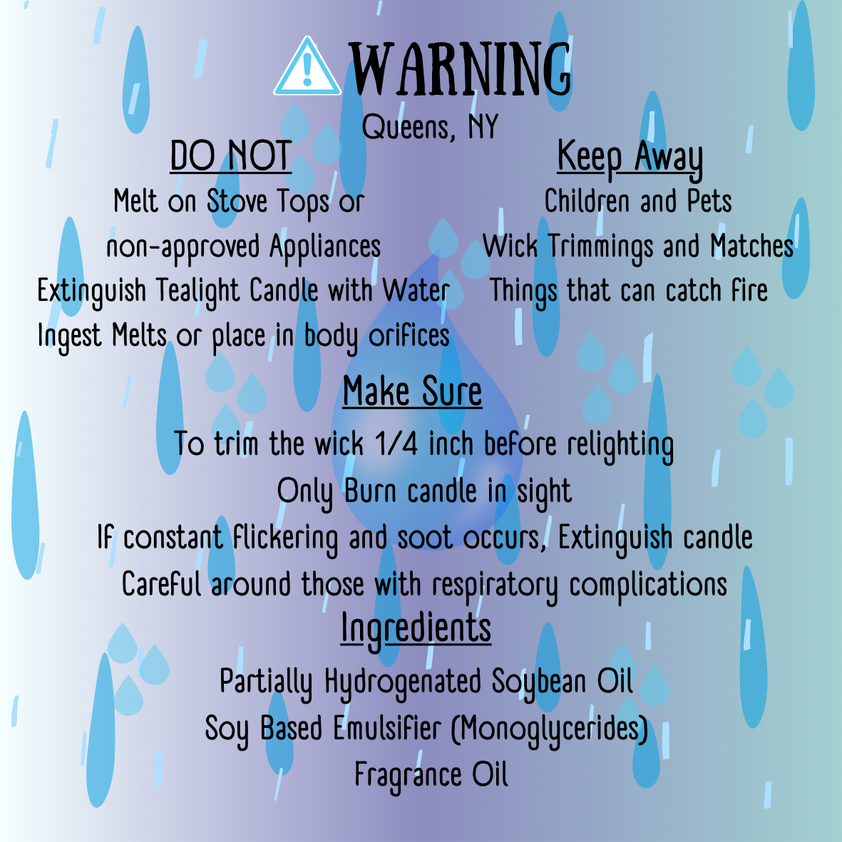 Do Not: Melt on Stove Tops or non-approved Appliances; Extinguish Tealight Candle with Water; Ingest Melts or place in body orifices
