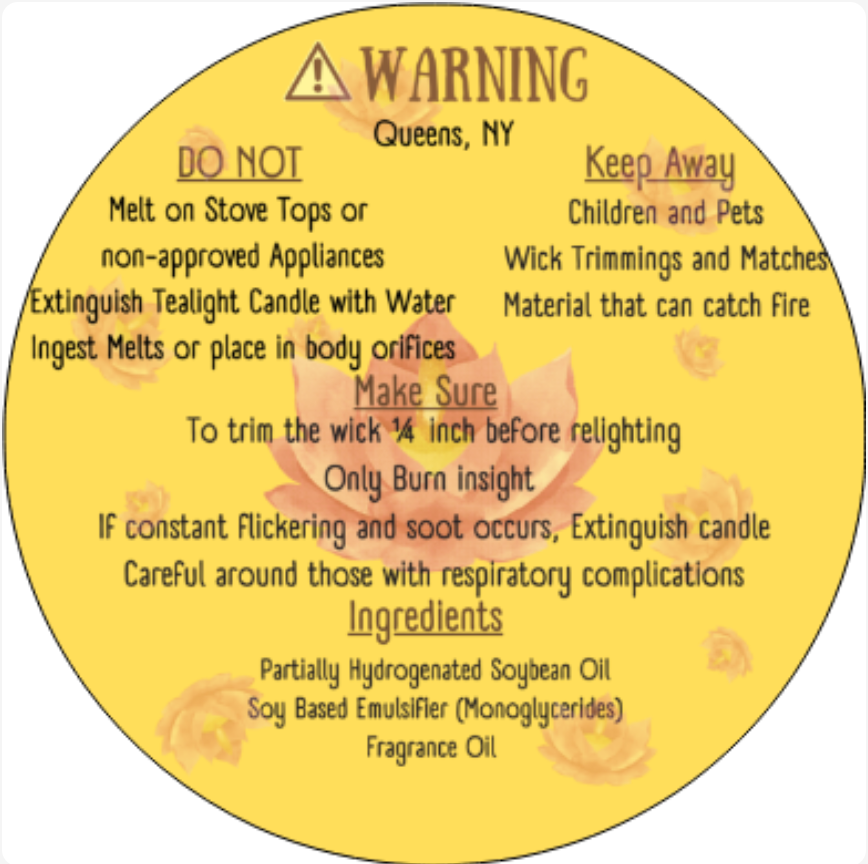 Do Not: Melt on Stove Tops or non-approved Appliances; Extinguish Tealight Candle with Water; Ingest Melts or place in body orifices
