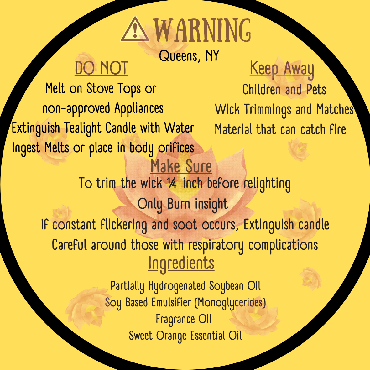 Do Not: Melt on Stove Tops or non-approved Appliances; Extinguish Tealight Candle with Water; Ingest Melts or place in body orifices